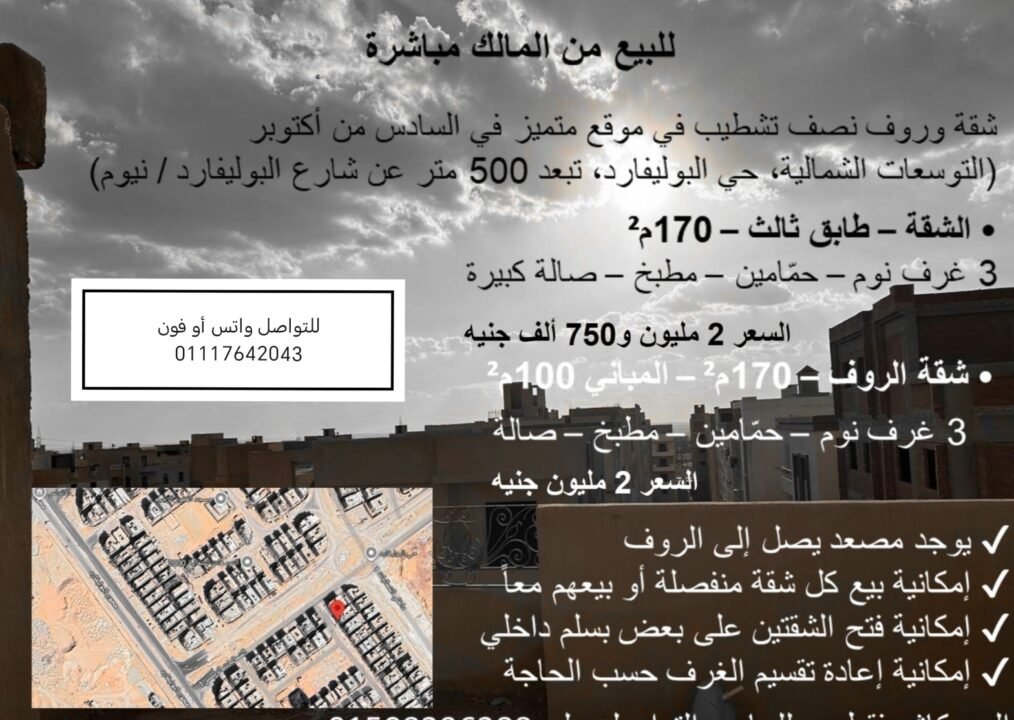 والروف ١٧٠متر و٣ غرف وحمامين ومطبخ وصاله السعر ٢مليون جنيه