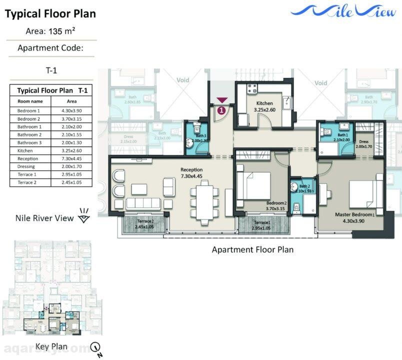 • 2 نوم – 3 حمام – ريسيبشن – مطبخ – 2 تراس.