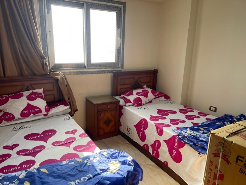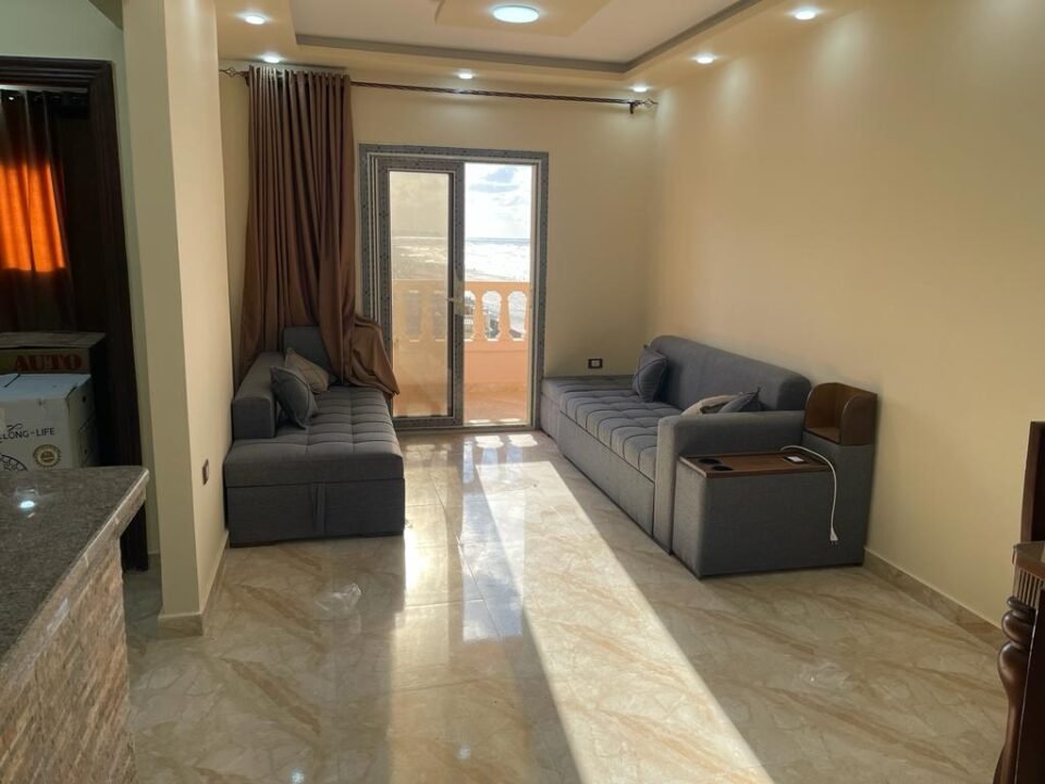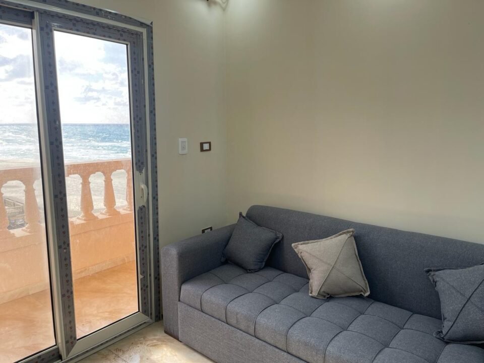 للبيع شقة صف اول بحر علي رمال شاطئ بيانكي العجمي فيو امتداد الشاطئ لا يفصلها اي شارع عن الشاطئ لانها علي رمال الشاطئ مباشرة حجرتان نوم اربعة سراير وريسبشن فيه كنبتان سرير تشطيب وفرش بمهندس ديكور سوبر لوكس