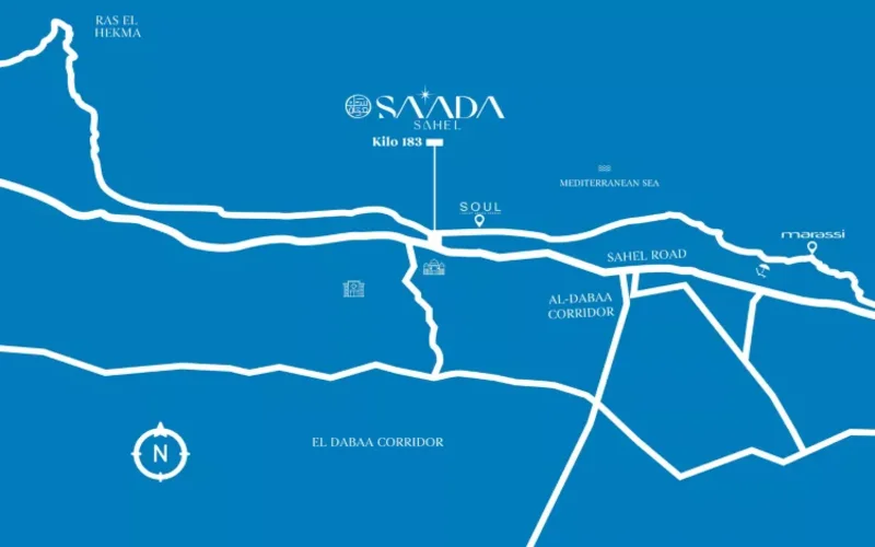 - الموقع الاستراتيجي: يقع منتجع سعادة بأرقى مكان في الساحل الشمالي، بالقرب من أبرز الطرق الرئيسية والمعالم الشهيرة بالمنطقة.