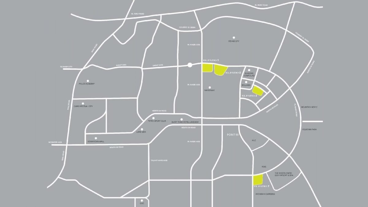 - يبعد كمبوند الباتيو 7 التجمع الخامس دقائق عن الطريق الدائري الإقليمي، مما يسهل التنقل بين القاهرة الجديدة وباقي المدن والمناطق المحيطة دون تعقيد.